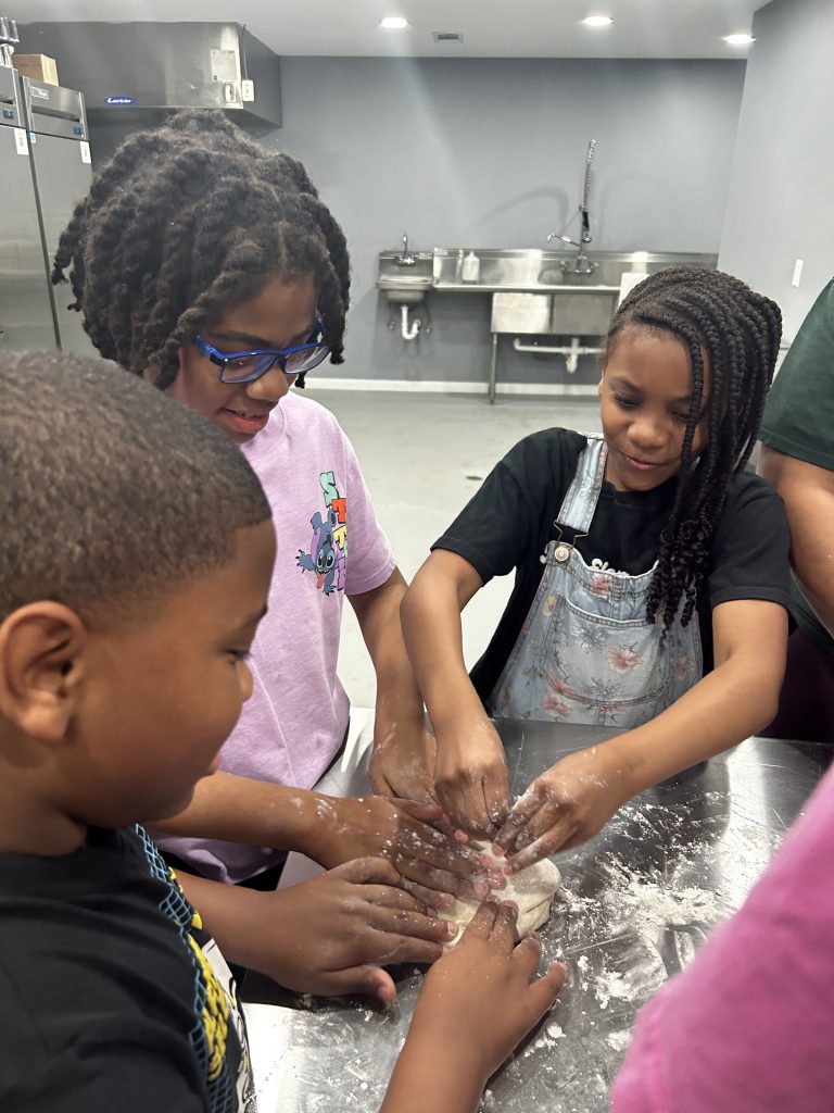 When the children arrived, we welcomed them and explained the day’s activities. After introductions and handwashing, the group was divided into five groups. Each group lightly floured their workspace and shaped the dough into 10-inch personal pan pizzas. The youth had a variety of toppings to choose from, including pepperoni, small chunks of ham, onions, bell peppers, and, of course, cheese.